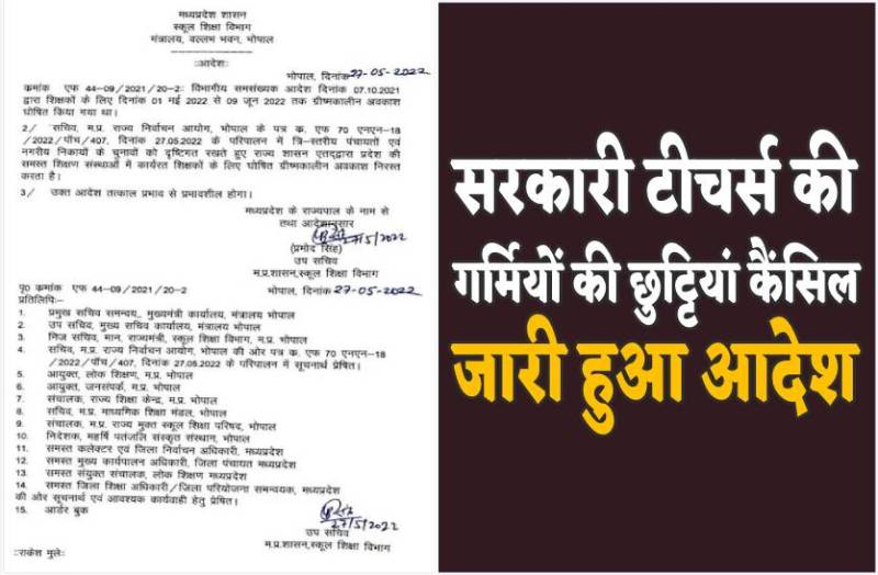भोपाल. मध्यप्रदेश में पंचायत चुनाव की घोषणा होने के कुछ घंटों बाद ही स्कूल शिक्षा विभाग ने बड़ा फैसला लेते हुए प्रदेश के सभी सरकारी स्कूलों के टीचर्स की गर्मियों की छुट्टियां निरस्त कर दी हैं। स्कूल शिक्षा विभाग की ओर से छुट्टियों को कैंसिल करने का एक आदेश भी जारी किया गया है जो तत्काल प्रभाव से लागू होगा। बता दें कि 1 मई से 9 जून तक शिक्षकों की गर्मियों की छुट्टियां घोषित की गई थीं जिन्हें अब पंचायत चुनावों के चलते निरस्त कर दिया गया है। जानकारी के मुताबिक त्रिस्तरीय पंचायत चुनाव में 4.25 लाख लोगों के स्टाफ की जरूरत होगी।