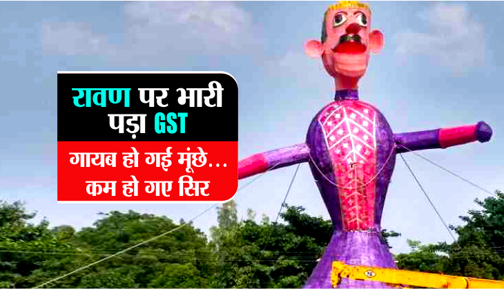 भोपाल। जीएसटी की मार से सोने की लंका का मालिक रावण भी अछूता नहीं रहा। शहर में दशहरे पर दहन के लिए बनाए जा रहे रावण के पुतलों से नौ सिर गायब हैं। मूंछ भी छोटी हो गई है। कलाकार इसकी वजह निर्माण सामग्री का १५-२० फीसदी तक महंगा होना बता रहे हैं।