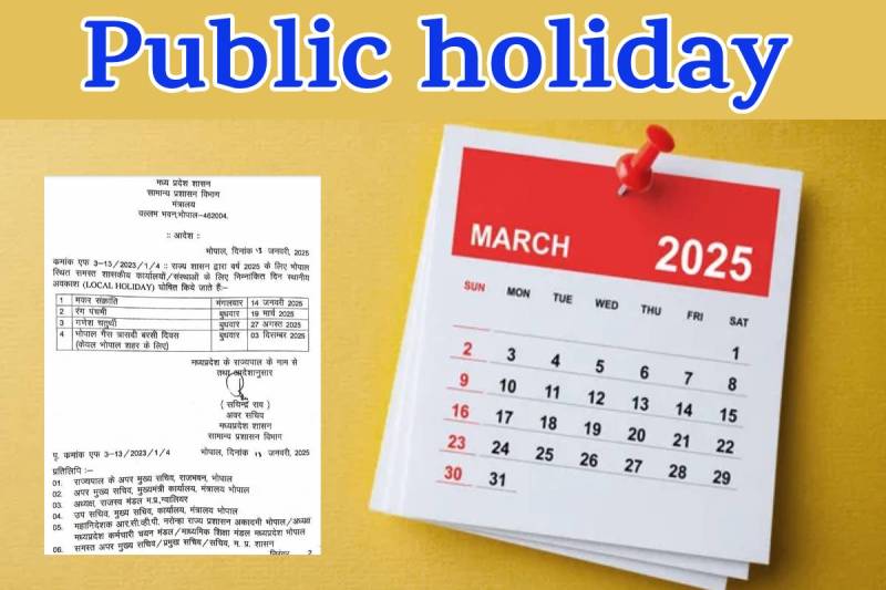 Holidays March 2025:मध्यप्रदेश के सरकारी कर्मचारियों के लिए खुशखबरी है। जानकारी के लिए बता दें कि राज्य शासन ने भोपाल स्थित समस्त शासकीय कार्यालयों और संस्थाओं में स्थानीय अवकाश घोषित किया है। सामान्य प्रशासन विभाग द्वारा जारी आदेश अनुसार रंग पंचमी बुधवार 19 मार्च को स्थानीय अवकाश घोषित किया है। इस दिन स्कूल, बैंक-कॉलेज, ऑफिस सब बंद रहेंगे।