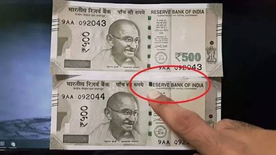 - 200, 500 और 2000 रुपये के नोट पर यह मूल्य एक रंग बदलने वाली स्याही से लिखा होता है. जब नोट को समतल रखा जाता है तो इन अंकों का रंग हरा दिखाई देता है, लेकिन जब इन्हें थोड़ा घुमाया जाए तो यह नीले रंग में बदल जाता है।