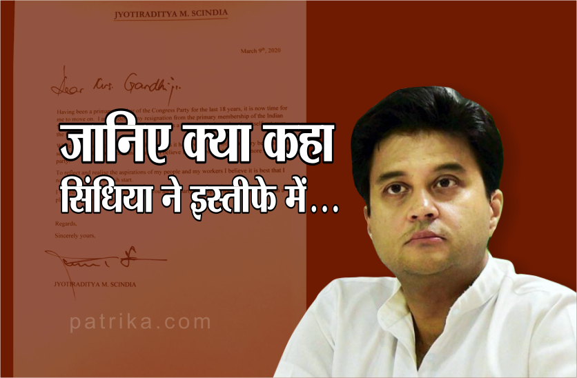 अंग्रेजी भाषा में सोनिया गांधी को दिये इस्तीफे में ज्योतिरादित्य सिंधिया ने कहा, जिसका हिन्दी अनुवाद कुछ इस तरह है। 'पिछले 18 वर्षों से कांग्रेस पार्टी के प्राथमिक सदस्य रहे, अब समय आ गया है, मुझे आगे बढ़ना है। मैं ने भारतीय राष्ट्रीय कांग्रेस की प्राथमिक सदस्यता से अपना इस्तीफा दे दिया और जैसा कि आप अच्छी तरह से जानते हैं, यह एक रास्ता है जो पिछले साल के दौरान खुद को आकर्षित कर रहा है।