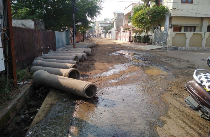 बदहाल सडक़ें, बिखरे पाइप, धूल, मिट्टी-कीचढ़ से रहवासी परेशान