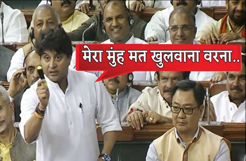 संसद में विपक्ष के अविश्वास प्रस्ताव का जबाव देते हुए सिंधिया उस वक्त नाराज हो उठे जब विपक्ष के सदस्यों ने दो साल में ही सब बदल गया कहते हुए शोर मचाना शुरु कर दिया। इससे सिंधिया अग्रेसिव हो गए और तत्काल जवाब दिया कि आपने ही मुझे बदला है..मेरा मुंह मत खुलवाना वरना...इस दौरान सिंधिया ने साफ साफ लफ्जों में ये भी कहा कि विपक्ष को खुजली बहुत होती है।