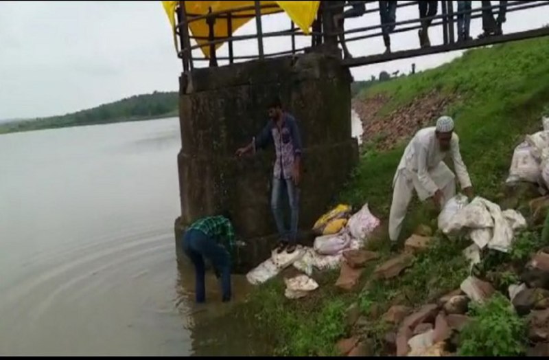 जलसंसाधन विभाग के अधिकारियों के पहुंचने से पहले ग्रामीणों ने खुद मेहनत कर मिट्टी की बोरियों को बैलगाड़ी से लाकर रिसाव को भरने की कोशिश की।