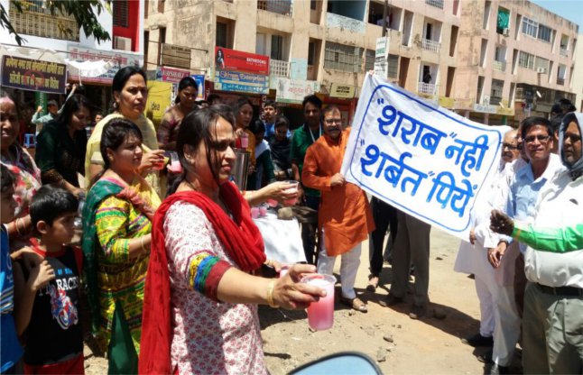 भोपाल। शराब सेहत के लिए हानिकारक है लेकिन शरबत इस मौसम में आपको राहत दे सकता है। जी हां यही कह कर कल्पना नगर के बच्चे और महिलाएं लोगों से शराब छोडऩे का आग्रह कर रहे हैं। पिछले कई दिनों से कल्पना नगर में खुली शराब की दुकान का विरोध कर रहे रहवासियों ने शुक्रवार सुबह से कई लीटर शरबत तैयार कर लिया। इसके बार वे दुकान के आसपास से गुजरने वालों के हाथ में ठंडा शरबत थमा रहे हैं। महिलाओं का कहना है कि शराब दुकान होने के कारण क्षेत्र का माहौल भी खराब हो रहा है। बच्चों पर बुरा असर पड़ता है। हमने बच्चों को इस लिए इस मुहिम में शामिल किया है ताकि वे समझ सकें कि शराब पीना कितना नुकसानदेय है।