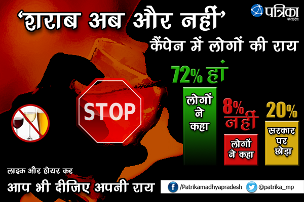 भोपाल। मध्य प्रदेश में शराब पर पूरी तरह बैन लगाने के लिए पत्रिका द्वारा सोशल प्लेटफॉर्म फेसबुक पर छेड़ी गई मुहिम में लोगों ने दिल खोलकर राय रखी गई। पिछले 72 घंटों में करीब 1135 कमेंट किए गए। जिसमें 72 प्रतिशत लोगों ने प्रदेश में शराब पर पूर्ण प्रतिबंध लगाने के लिए सहमति जताई, जबकि 8 प्रतिशत लोग शराब पर पाबंदी लगाने के खिलाफ थे। बाकि 20 प्रतिशत लोगों ने शराब पर प्रतिबंध लगाने का फैसला सरकार पर छोड़ दिया।