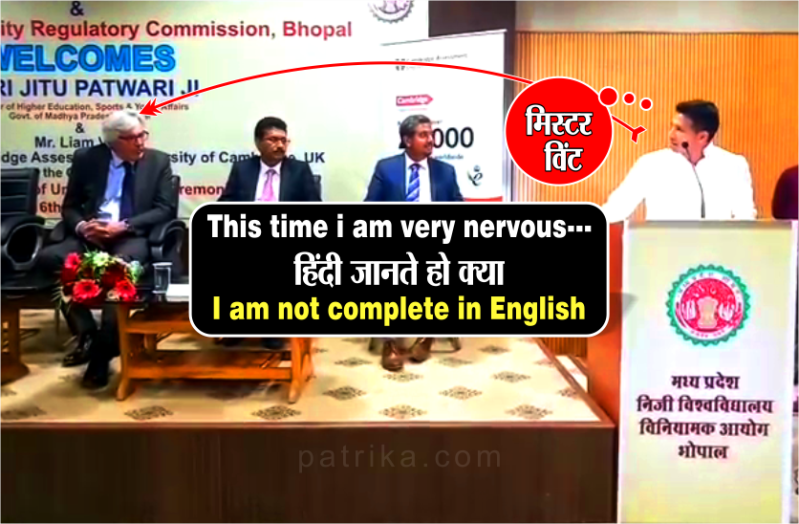 लोगों को संबोधित करते हुए मंत्री जीतू पटवारी ने कहा कि...मिस्टर विंट, This time i am very nervous..हिंदी जानते हो क्या थोड़ा बहुत? I am not complete in English...मैं बैठे-बैठे यह विचार भी कर रहा था कि कोई कम्युनिकेट भी करो भाई कि मिस्टर विंट क्या कह रहे हैं..अब जैसी मेरी स्थिति हैं वैसी ही हमारे प्रदेश के स्टूडेंट्स की भी है।