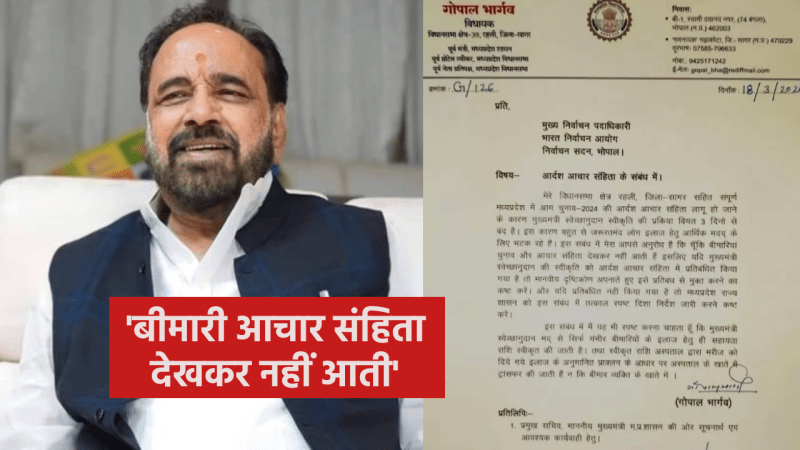 मध्यप्रदेश की सरकार में मंत्री रह चुके गोपाल भार्गव सागर जिले की रहली विधानसभा क्षेत्र से भाजपा के विधायक हैं। 9 बार के विधायक गोपाल भार्गव ने चुनाव आयोग को पत्र में लिखकर कहा है कि मुख्यमंत्री स्वेच्छानुदान से जरूरतमंद बीमार व्यक्तियों का अलाज होता है और सरकार आर्थिक मदद करती है। इन दिनों लोकसभा चुनाव 2024 की आचार संहिता प्रभावी होने के कारण तीन दिन से स्वेच्छानुदान पर प्रतिबंध लग गया है। ऐसे में अब इसका असर लोगों पर पड़ने लगा है।