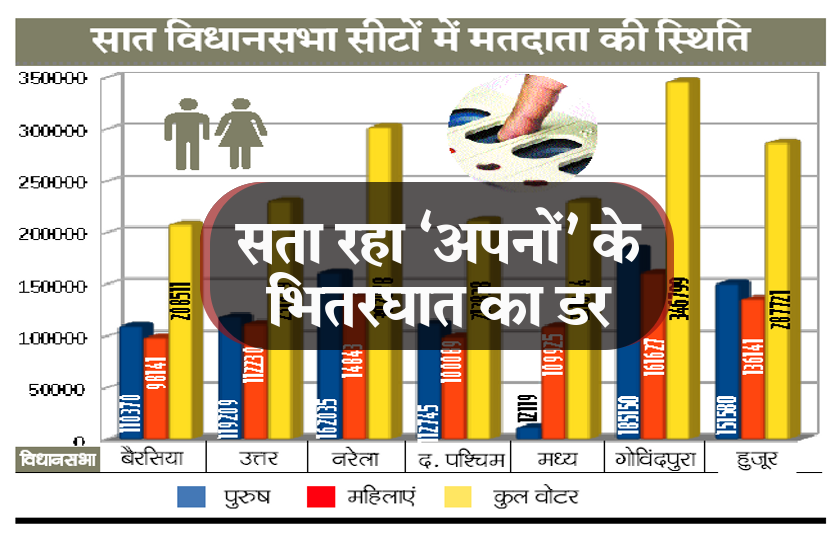 भोपाल. राजधानी में नामांकन प्रक्रिया में नाम वापसी के बाद बैरसिया को छोडकऱ दोनों प्रमुख दलों भाजपा-कांग्रेस के बागी शांत दिखाई दे रहे हैं, फिर भी प्रत्याशियों को कहीं न कहीं भितरघात का डर सता रहा है। इसकी वजह जातिगत समीकरण, क्षेत्र की समस्याएं, वार्ड के छोटे-छोटे मुद्दे हैं जो अब वोट मांगते समय जनता प्रत्याशियों के सामने उठा रही है।