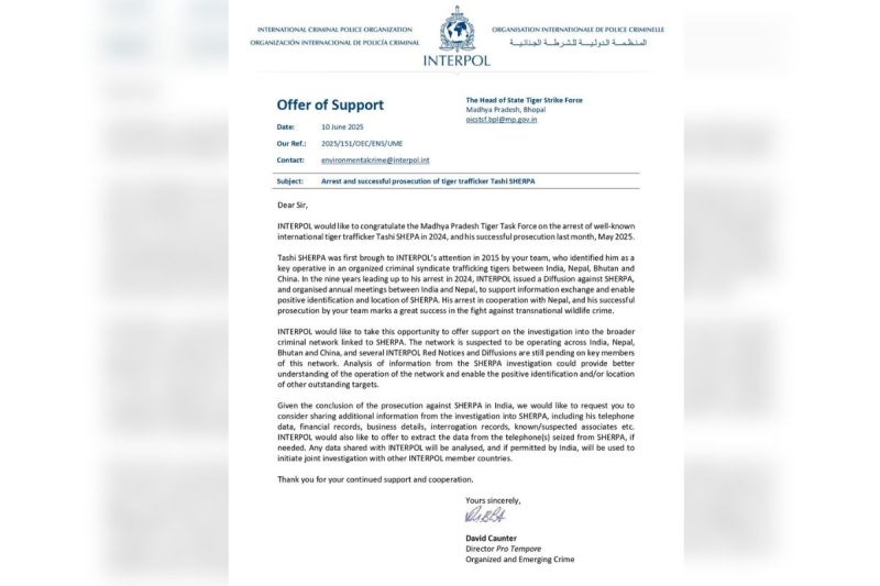 ताशी शेरपा को सजा दिलाने के लिए इंटरपोल ने मध्यप्रदेश वन विभाग की स्टेट टाइगर फोर्स को बधाई पत्र भेजा है। अपराधी ताशी शेरपा अंतर्राष्ट्रीय बाघ तस्करी गिरोह की महत्वपूर्ण कड़ी है। जिसका नेटवर्क भारत, नेपाल, भूटान और चीन तक फैला हुआ है। जुलाई 2024 में सुप्रीम कोर्ट ने मामले की गंभीरता को देखते हुए ताशी शेरपा की जमानत याचिका का खारिज कर ट्रॉयल कोर्ट नर्मदापुरम को एक साल के अंदर ट्रायल पूरा करने के निर्देश दिया था।