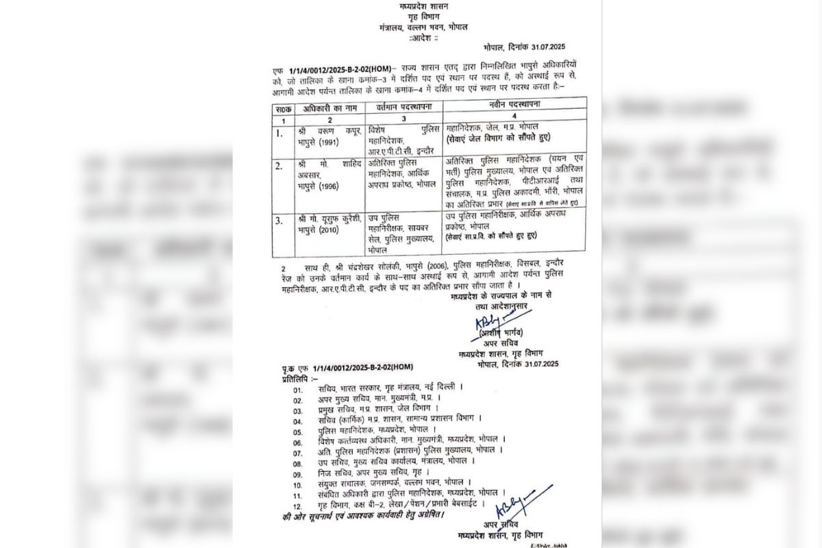 वरुण कपूर को जेल महानिदेशक (डीजी) नियुक्त किया गया है। साथ ही मोहम्मद शाहिद अबसार को अतिरिक्त पुलिस महानिदेशक (एडीजी) चयन एवं भर्ती, पुलिस प्रशिक्षण अनुसंधान संस्थान (पीटीआरआई) और संचालक पुलिस अकादमी भौंरी की जिम्मेदारी सौंपी गई है। वहीं, मोहम्मद यूसुफ कुरैशी को आर्थिक अपराध प्रकोष्ठ (EOW) में पुलिस उपमहानिरीक्षक (DIG) बनाया गया है।