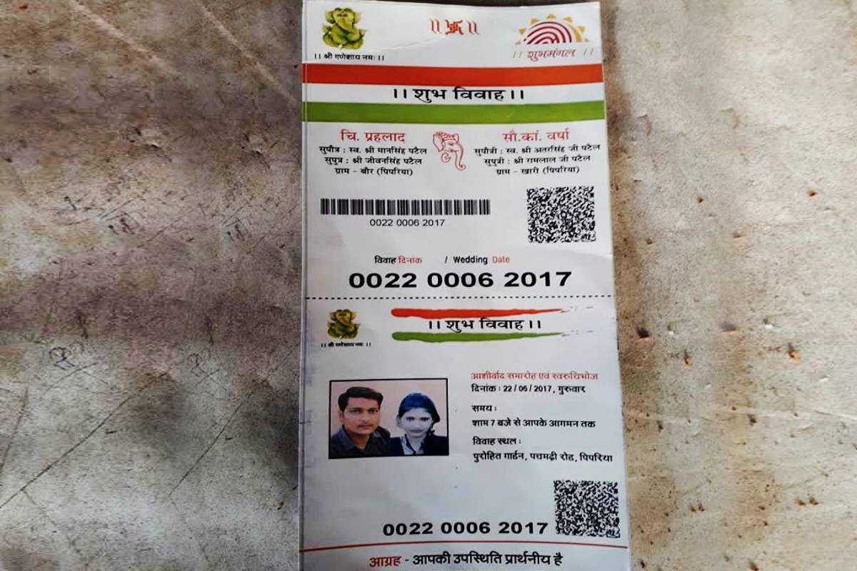 सोशल मीडिया पर वायरल होने वाला शादी का ये कार्ड दरअसल बिलकुल आधार कार्ड की डिजाइन का है। पहली नजर में देखने पर कोई भी इसे देखकर धोखा खा सकता है कि ये किसी का आधार कार्ड है। इस कार्ड पर दूल्हे का नाम प्रहलाद पटेल निवासी बौर गांव, पिपरिया लिखा हुआ है। शादी की तारीख 22 जून 2017 लिखी हुई है। ठीक आधार कार्ड नंबर की ही तरह शादी की तारीख भी कार्ड पर लिखी है और क्यूआर कोड स्कैनर लगा हुआ है। दुल्हा-दुल्हन की फोटो भी है और डिजाइन पूरी तरह से आधार कार्ड के जैसा है।