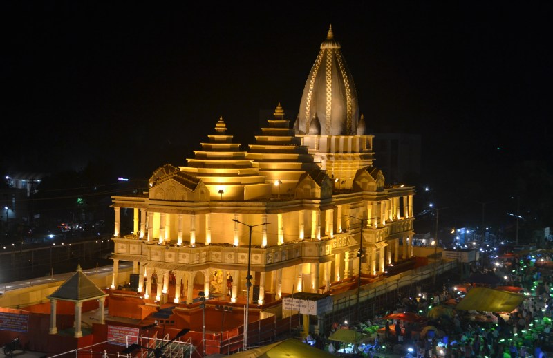 इस झांकी को भोपाल में निवासरत बंगाली कारीगर दीपक मंडल और कोलकाता से आए सहपाठी कारीगरों ने तैयार किया है। दीपक मंडल ने बताया कि इस झांकी को आकार देने में उन्हें लगभग ढाई माह का समय लगा। हालाकि यह मंदिर अभी अयोध्या में बना नहीं है, लेकिन इंटरनेट पर प्रस्तावित मंदिर का ब्रोशर है। इंटरनेट पर ब्रोशर देखकर इस झांकी को तैयार किया गया है। इसमें उनके साथ 40 से अधिक बंगाली कलाकारों ने सहयोग किया है। इस झांकी में 22 हजार बांस, 600 बल्ली, 14 हजार मीटर कपड़ा, 14 क्विंटल किल,228 किलो फेवीकॉल का इस्तेमाल हुआ है।