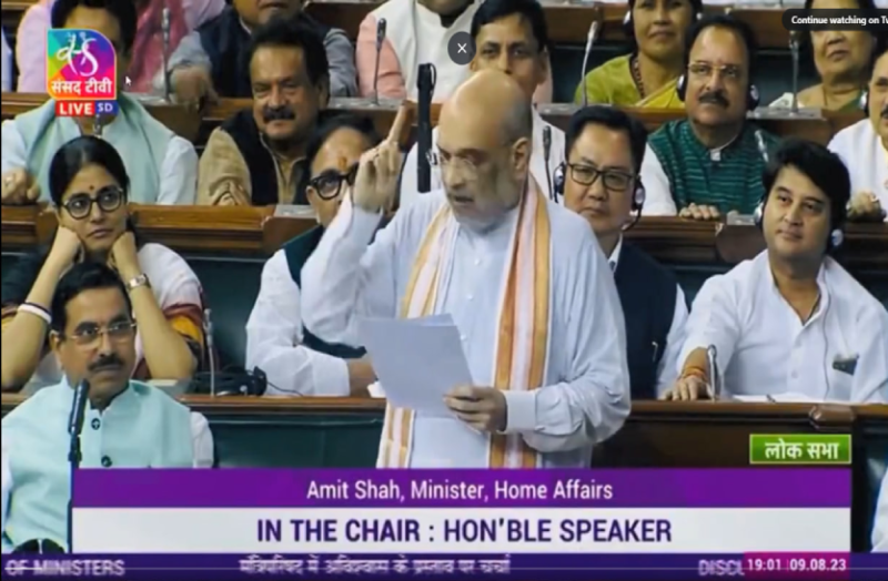 लोकसभा में भाषण देते अमित शाह, पीछे खामोश बैठे ज्योतिरादित्य सिंधिया।