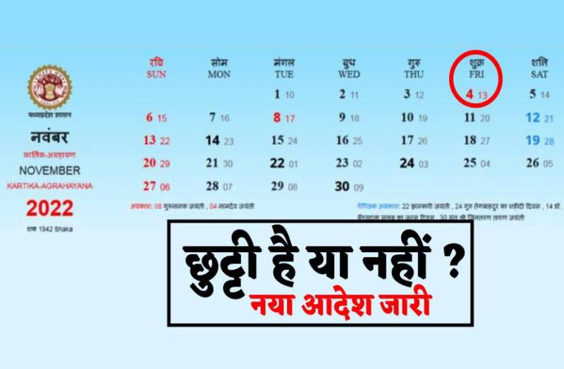 मध्यप्रदेश शासन सामान्य प्रशासन विभाग की ओर से जो आदेश जारी किया गया है उसमें बताया गया है कि शासकीय केन्द्रीय मुद्रणालय, भोपाल की वेबसाइट पर दर्शित डिजीटल कैलेंडर में 4 नवंबर 2022 को सामान्य अवकाश दर्शाया गया है जबकि संलग्न अधिसूचना में 4 नवंबर 2022 को ऐच्छिक अवकाश है। इसलिए विभागीय अधिसूचना के आधार पर डिजीटल कैलेंडर को संशोधित करने का कष्ट करें।