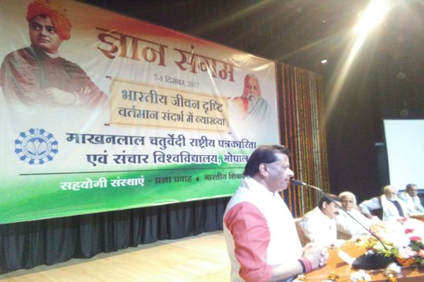 भोपाल। मखानलाल चतुर्वेदी राष्ट्रीय पत्रकारिता विश्वविद्यालय द्वारा गुरुवार को भोपाल के प्रशासन अकादमी के स्वर्ण जंयती सभागार में ज्ञान परंपरा पर राष्ट्रीय विमर्श ज्ञान-संगम का आयोजन किया गया। इस कार्यक्रम में उच्च शिक्षा मंत्री जयभान सिंह पवैया शामिल हुए।