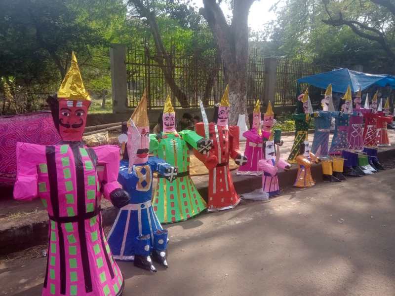 दशहरा मैदान में खड़े हुए रावण, मेघनाद, कुंभकरण के पुतले, इस बार कोरोनो ने छोटा किया कद, अधिकतम 51 फीट के पुतलों का होगा दहन
