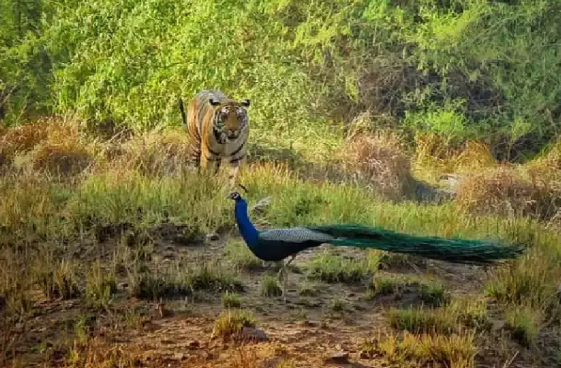 इस फोटो की खास बात यह है कि इसमें राष्ट्रीय पक्षी मोर के साथ एक बाघ साफ तौर पर देखा जा सकता है। इस फोटो में बाघ क्या कर रहा है यह स्पष्ट नहीं हुआ, लेकिन ऐसा लग रहा है जैसे वह मोर की सुंदरता देख कर शिकार करना ही भूल गया हो।