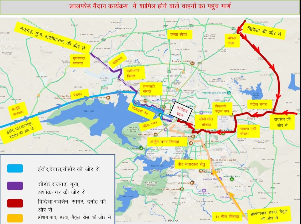 - सीहोर एवं राजगढ़, गुना, अशोक नगर जिले से आने वाली बसे लालघाटी चैराहा, व्हीआईपी रोड, रेतघाट, पाॅलिटेक्निक काॅलेज चैराहा, गांधीपार्क , राजभवन के सामने से एमव्हीएम मैदान में पार्क होगी।