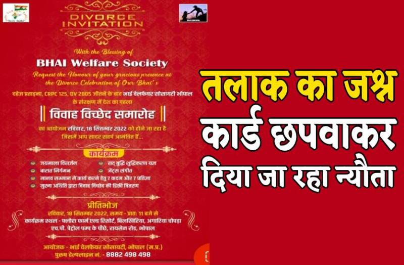 जो कार्ड सोशल मीडिया पर तेजी से वायरल हो रहा है उसके मुताबिक तलाक पार्टी का आयोजन 18 सितंबर को भोपाल में रायसेन रोड पर एक प्राइवेट रिसोर्ट में किया जाना है। तलाक पार्टी के दौरान शादी के जैसे कार्यक्रमों के आयोजन का जिक्र भी कार्ड में है और उसमें लिखा है कि इस दौरान जयमाला विसर्जन, बारात निर्गमन के साथ जेंट्स संगीत, सद्बुध्दि शुध्दिकरण यज्ञ और मानव सम्मान में कार्य करने हेतु सात कदम और सात प्रतिज्ञा भी दिलाना शामिल है, साथ ही प्रीतिभोज का आयोजन भी तलाक पार्टी में रखा गया है।