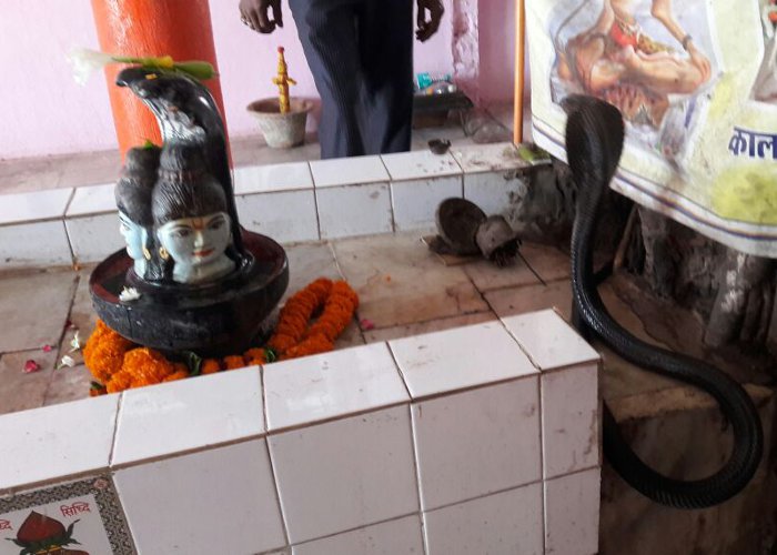 भोपाल। भोलेनाथ ने अपने गले में जहरीला नाग धारण कर रखा है। यदि ऐसा ही नाग किसी मंदिर में आ जाए और शिवलिंग से लिपट जाए तो श्रद्धालुओं का तांता लगना स्वाभाविक ही है। हबीबगंज रेलवे स्टेशन स्थित शिव मंदिर में यह नजारा देखने वालों की उस समय भीड़ लग गई, जब एक बड़ा नाग अपना फन फैलाए फुफकारते हुए मंदिर में जा घुसा। उसके बाद वह शिवलिंग के पास जाकर बैठ गया। वह किसी को भी अपने नजदीक नहीं किसी को नहीं आने दे रहा था। जो भी उसके पास जा रहा था वह फुफकार रहा था।