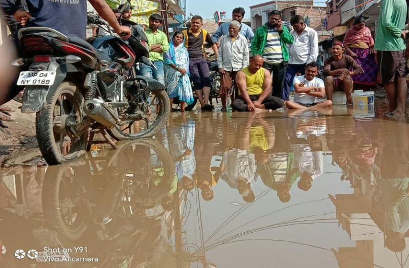 जलभराव बना मुसीबत, रहवासियों ने सडक़ पर कीचड़ में बैठकर किया प्रदर्शन