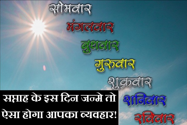 पंडित सुनील शर्मा के अनुसार आपके जन्म का वार क्या था यानी आप किस दिन पैदा हुए थे इस बात पर भी काफी हद तक आपका स्वभाव और व्यवहार निर्भर करता है। साथ ही इससे यह भी पता चलता है कि जीवन के कौन से साल सुखदायी या दुखदायी होंगे।