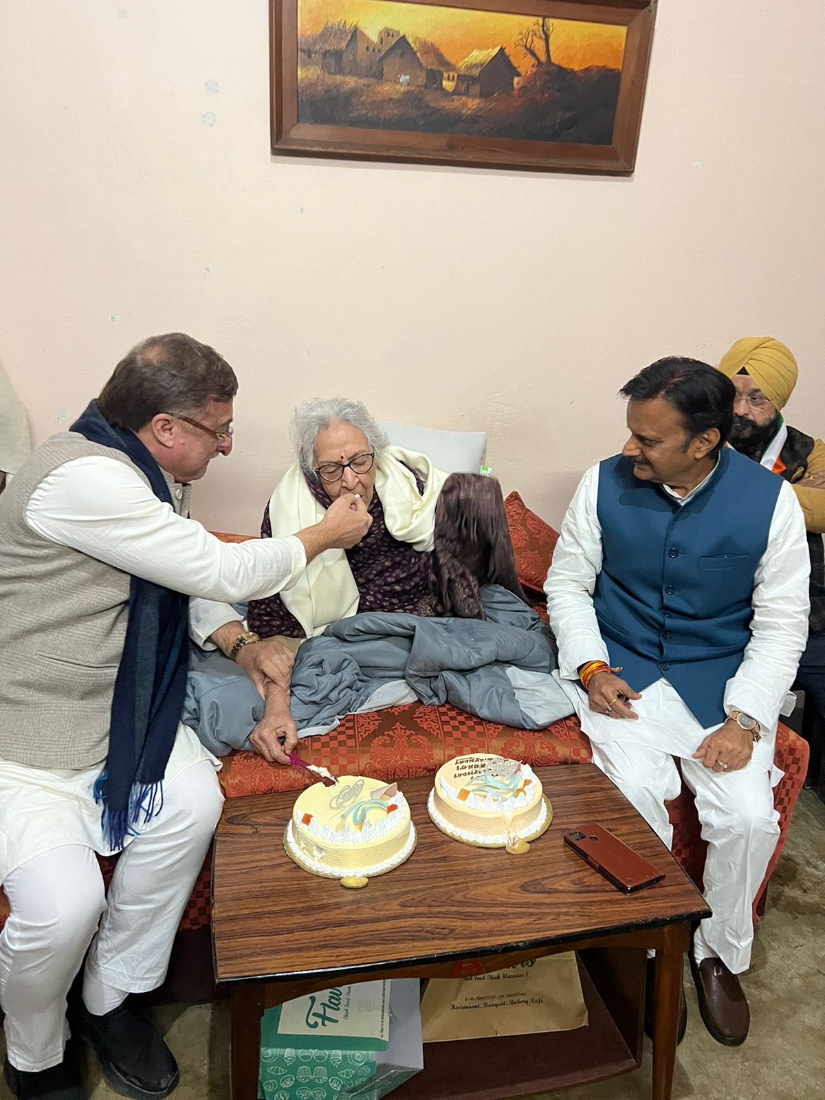 बुआ रमा तनखा को केक खिलाते राज्यसभा सांसद विवेक तनखा साथ में बैठे डिप्टी सीएम राजेंद्र शुक्ला।