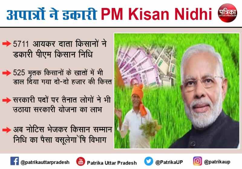 बिजनौर. उत्तर प्रदेश के बिजनौर जिले में हजारों अपात्रों और सैकड़ों मृतक किसानों के बैंक खातों में प्रधानमंत्री किसान सम्मान निधि योजना के तहत करोड़ों रुपए की किस्त जाने के मामले का खुुलासा हुआ है। बताया जा रहा है कि अब इन किसानाें को चिन्हित कर पैसा वसूला जाएगा। फिलहाल सरकार ने इन खातों में किस्त भेजने पर रोक लगा दी है। इनमें अधिकतर उन किसानों के खाते शामिल हैं, जो आयकरदाता होने के बावजूद पीएम किसाान सम्मान निधि का लाभ ले रहे हैं। इतना ही नहीं इनमें सरकारी नौकरी करने वाले लोग भी शामिल हैं। कृषि विभाग का कहना है कि नियमानुसार आयकरदाता को पीएम किसान निधि का लाभ नहीं दिया जा सकता है। अब कृषि विभाग इन सभी को नोटिस भेजकर पैसा वसूलने की बात कह रहा है।