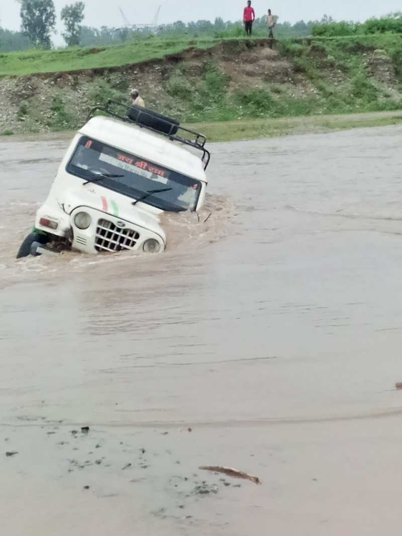 बिजनौर ( Bijnor ) पुलिस से बचने के लिए एक मैक्स चालक ने यात्रियाें से भरी मैक्स काे नदी में ही घुसा दिया। बारिश के चलते नदी में पानी का स्तर अधिक था इससे यात्रियाें से भरी मैक्स बीच नदीं में फंस गई। पुलिस (up police ) काे सूचना मिली ताे माैके पर रेस्कयू किया गया और नदी के बीच फंसे सभी यत्रियाें काे किसी तरह सकुशल बाहर निकाला गया। बाद में क्रेन की मदद से मैक्स कार ( मिनी ट्रक ) को भी बाहर निकाला गया।