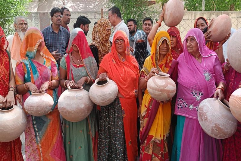 नोखा के जोरावरपुरा में पेयजल समस्या से परेशान होकर मटका फोड़कर प्रदर्शन करती महिलाएं।