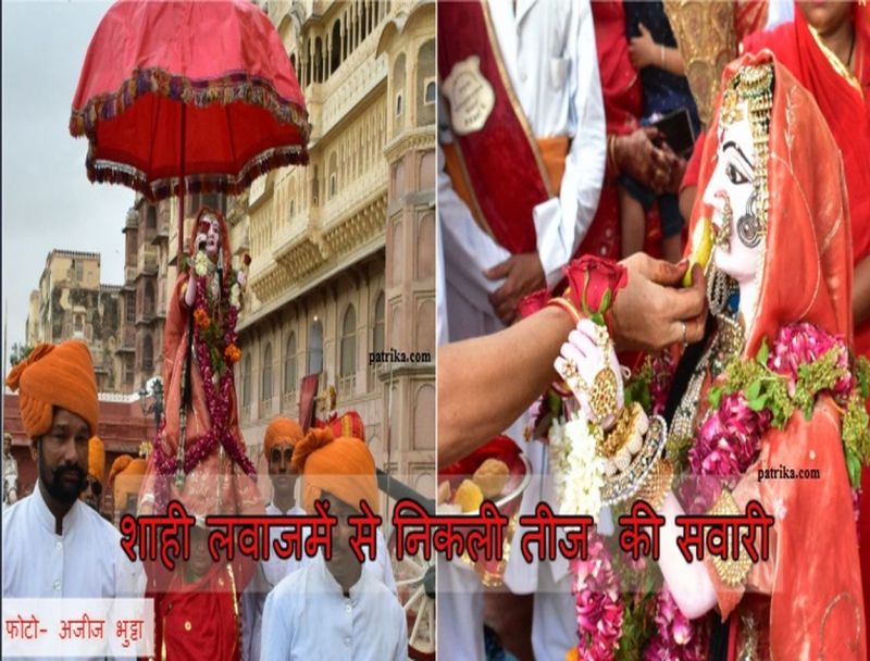 बीकानेर. रियासतकालीन परम्परा के तहत बड़ी तीज पर जूनागढ़ जनाना ड्योढ़ी से शाही लवाजमें के साथ तीज माता की सवारी निकली। बैण्ड की स्वर लहरियों और विशेष सुरक्षा के बीच शाही सवारी चौतीना कुआ पहुंची। यहां महिलाओं ने तीज माता की सवारी के दर्शन कर मनवांछित फल की कामना की। बीकानेर पूर्व राजपरिवार की ओर से तीज माता का पूजन कर पानी पिलाने की रस्म निभाई गई। महिलाओं ने तीज माता की मूर्ति के समक्ष पारम्परिक गीत और नृत्य प्रस्तुत किए।