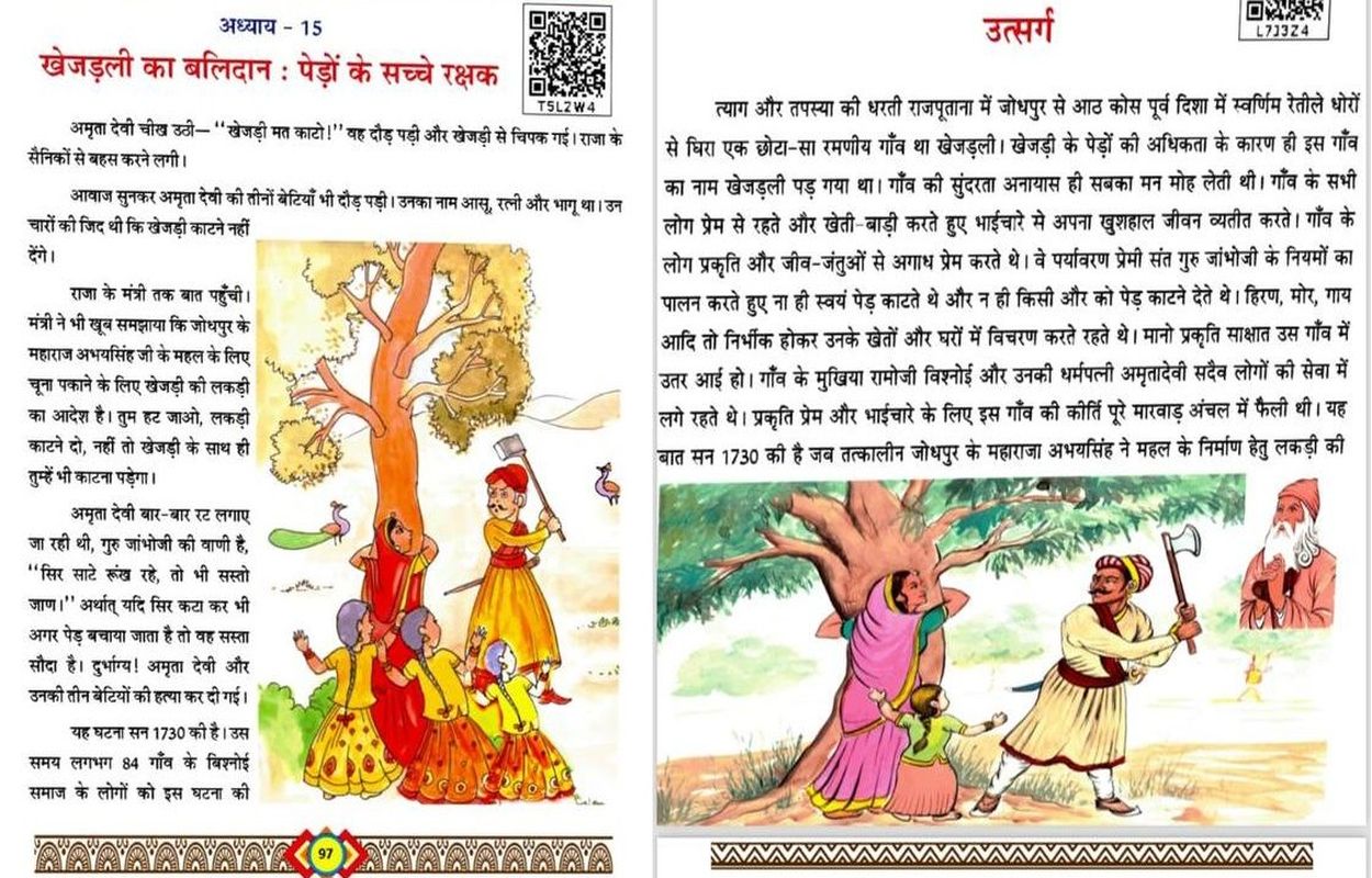 वर्ष 1730 में जोधपुर के खेजड़ली गांव की यह सच्ची घटना अब पर्यावरण और पेड़ों की रक्षा के संस्कार का बीज कोमल मन में बोएगी। देशभर के साथ प्रदेश के स्कूलों में पहुंची एनसीईआरटी पाठ्यक्रम की कक्षा 3, 4 और 5 की पुस्तकों खेजड़ली बलिदान की गाथा को शामिल किया हुआ है। इस गाथा को एक-एक अध्याय के रूप में तीनों कक्षाओं की पाठ्य पुस्तक में जगह मिली है। विद्यार्थियों के पास पहुंची पुस्तकों में पेड़ों की रक्षा के खेजड़ली आंदोलन में मां अमृतादेवी बिश्नोई और 363 शहीदों की कहानी छपी हुई है। जो खेजड़ली आंदोलन, खेजड़ी वृक्ष के महत्व, और खेजड़ली नरसंहार की विद्यार्थियों को जानकारी देंगे।