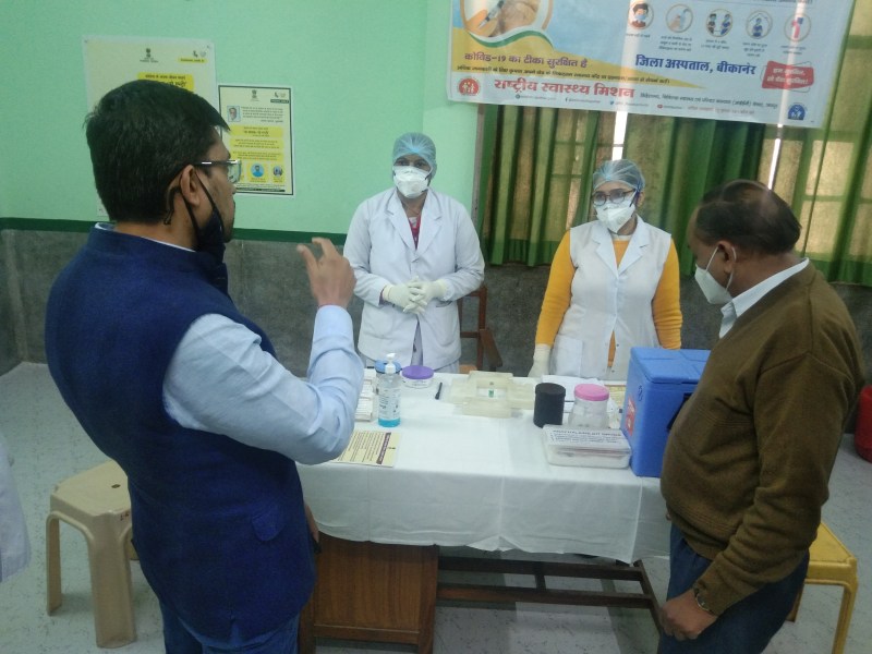 टीका लगाने के बाद सरदार पटेल मेडिकल कॉलेज के अतिरिक्त प्राचार्य डॉ रंजन माथुर और पीबीएम अस्पताल के अधीक्षक परमेंद्र सिरोही संपूर्ण व्यवस्थाओं को देख रहे थे और अस्पताल परिसर तथा कॉलेज परिसर में लगे चारों सेंटरों का जायजा लेकर व्यवस्थाओं को देख रहे थे।