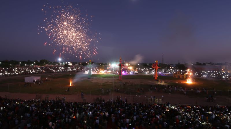 राम लक्ष्मण दशहरा कमेटी की ओर से मेडिकल कॉलेज मैदान में रावण का पुतला दहन किया गया। जयश्री राम के जयकारों के साथ रावण,कुंभकरण व मेघनाद के पुतलों व लंका का दहन आतिशबाजी के साथ हुआ। रंगीन रोशिनयों से आसमान अट गया। रिमोट से दो मुंह वाले रावण के पुतले का दहन किया गया। रावण पुतले ने आंखों से आग उगली। मैदान आतिशबाजी के धमाकों से गूंज उठा।