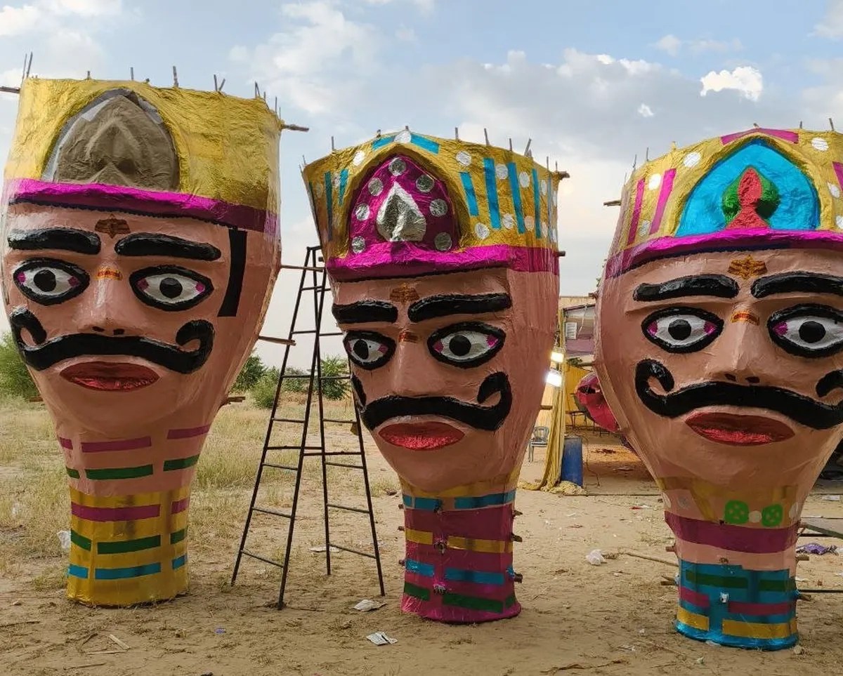 बीकानेर में दशहरा उत्सव के लिए तैयार हुए 85 फीट ऊंचे रावण, जिनकी आंखें लाल होंगी, मुंह से चिंगारियां निकलेगी और नाभि पर चकरी घूमेगी। जबकि कुंभकर्ण और मेघनाद भी मैदान में भव्य रूप में नजर आएंगे। पुतले के आगे और पीछे दोनों तरफ मुंह होगा, जो तीन दिशाओं में घूमेगा। रावण के पुतले की तलवार हवा में लहराएगी और दहन के दौरान अट्टाहास करता नजर आएगा।