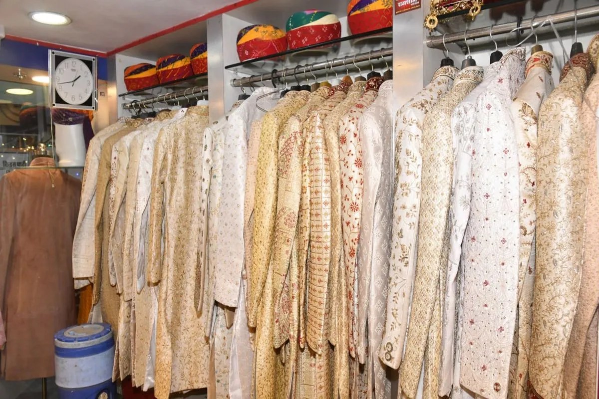 एक शोरूम में लगी शेरवानी।