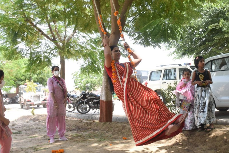 हाथों पर रचाए मेहंदी मांडणे, झूला-झूलने की निभाई परम्परा