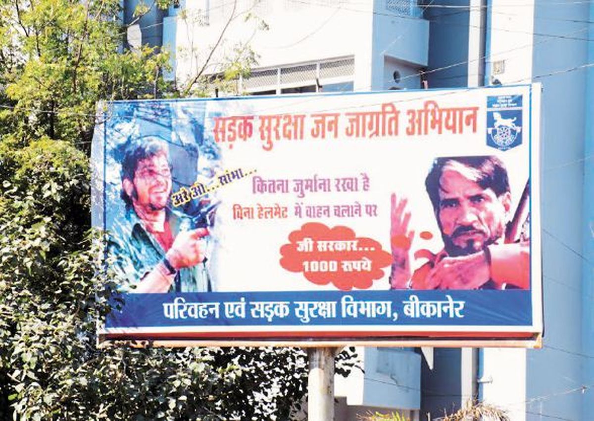 अरे ओ सांभा कितने आदमी थे ..., सरदार पांच आदमी थे ... यह डायलॉग शोले फिल्म का आज भी लोगों की जुबां पर है। ऐसे ही कुछ डायलॉग को प्रदर्शित कर यातायात पुलिस वाहन चालकों को यातायात नियमों के प्रति जागरूक करने की कोशिश कर रही है। शहर में यातायात पुलिस की ओर से बड़े-बड़े होर्डिंग्स लगाकर लोगों को हेलमेट पहनने और सीट बैल्ट लगाने के लिए जागरूक किया जा रहा है। इसी उद्देश्य से यातायात पुलिस ने होर्डिंग्स पर कुछ इस तरह के ध्यान आकर्पित करने वाले स्लोगन लिखवाए हैं। यातायात पुलिस ने अरे ओ सांभा कितना जुर्माना रखा है बिना हेलमेट में वाहन चलाने पर, जी सरकार एक हजार रुपए ..., हेलमेट नहीं पहनने पर ट्रेफिक पुलिस से बहस कर सकते हैं यमराज से नहीं ..., मैं भाग्यशाली हूं मुझे दोबारा सिर मिल गया लेकिन आपको नहीं मिलेगा इसलिए हेलमेट जरूर पहनने ... सरीखे डायलॉग लिखवाए गए हैं।