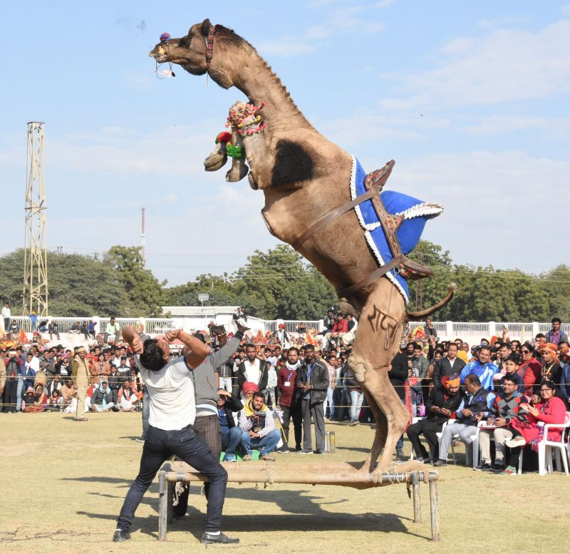 बीकानेर. ढोल व लोकसंगीत की स्वरलहरियों पर नाचते सजे-धजे ऊंट, ऊंटों पर बैठे रौबिले व भारतीय परिधान में सजे देशी और विदेशी सैलानी, दो जलते अंगारे, दो टांगों को अपने कद से ऊंचा उठाकर करतब दिखाते ऊंटो्ं को देखकर करणी स्टेडियम में बैठा हर दर्शक रोमांचित हो उठा। यह सारा नजारा शनिवार को डॉ. करणीसिंह स्टेडियम में अंतरराष्ट्रीय ऊंट उत्सव के तीसरे दिन व मुख्य कार्यक्रमों के दौरान दर्शकों के सामने आया। जिला प्रशासन व पर्यटन विभाग के संयुक्त तत्वावधान में आयोजित इस उत्सव का उद्घाटन जिला कलक्टर कुमार पाल गौतम, बीएसएफ के मेजर जनरल जे.एस.नंदा, पुलिस अधीक्षक प्रदीप मोहन शर्मा ने तिरंगे गुब्बारे तथा सफेद कपोत उड़ाकर किया। इसके बाद शुरू हुई ऊंटों के नृत्य, श्रृंगार, फर कटिंग आदि की प्रतियोगिताओं में हर कोई रोमांचित हो रहा था।