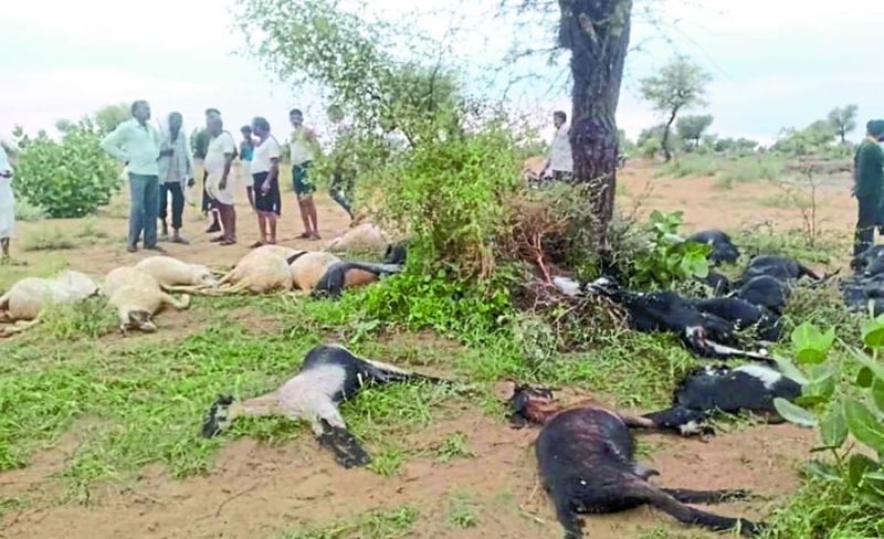 बीठनोक निवासी विजय मंगलवार को रोही में अपनी भेड़ें व बकरियों को चराने के लिए गया था। दोपहर करीब साढ़े तीन बजे बारिश होने लगी। वह एक जगह ठहर गया, जबकि भेड़े-बकरियां खेजड़ी के पेड़ के नीचे खड़ी थीं, तभी आकाशीय बिजली गिरी, जिससे 41 भेड़-बकरियों की मौत हो गई। हादसे का पता चलने पर अशोक पुरोहित, नरेन्द्र भाटी, दुर्गाप्रसाद पुरोहित, आशु भाटी सहित अनेक ग्रामीण मौके पर पहुंचे। ग्रामीणों ने जिला कलक्टर को पत्र प्रेषित कर पीडि़त को मुआवजा दिलाने की मांग की है।