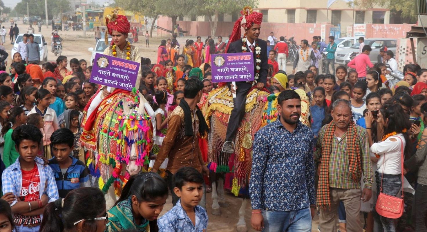 बीकानेर. लोकतंत्र के उत्सव में बढ़-चढ़कर भागीदारी निभाने के लिए मंगलवार को ग्रामीण क्षेत्रों में 'वोट बारात' निकाली गई। इसमें नाचते-झूमते ग्रामीणों ने विधानसभा चुनाव के दौरान शत-प्रतिशत मतदान करने का संदेश दिया। मतदाता जागरूकता अभियान के तहत सरगम सप्ताह के तीसरे दिन निकाली गई 'वोट बारात' में सजे-धजे ऊंट-घोड़ों और बैंड की स्वर लहरियों के बीच दूल्हे-दुल्हन के साथ उनके परिजनों व ग्रामीणों ने सात दिसम्बर को होने वाले विधानसभा चुनावों में मताधिकार के उपयोग का आह्वान किया।