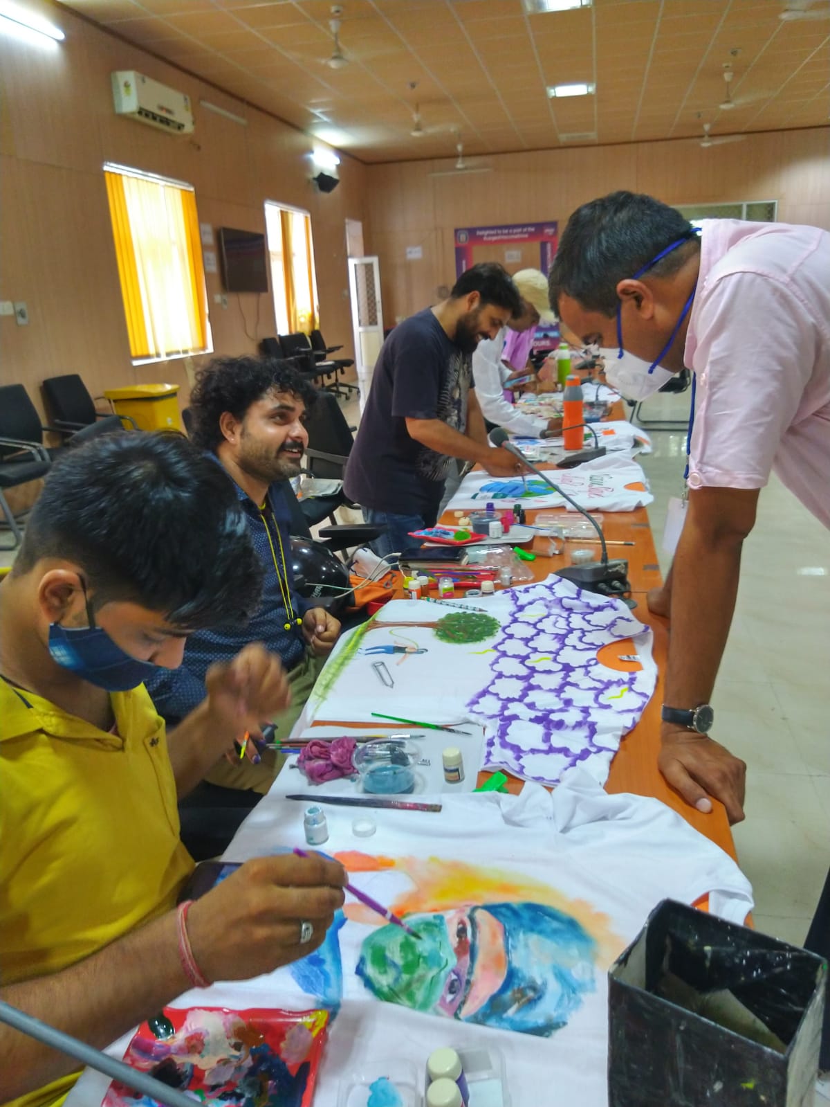 बीकानेर.सरदार पटेल मेडिकल कॉलेज का सभागार कक्ष। यहां टेबलों पर चिकित्सकों के हाथों में कलर की कुची। कोई चिकित्सक टी शर्ट पर सीरिंज, वैक्सीन लगाता तो कोई चिकित्सक तो किसी ने पेड़ की आकृति बना रहे थे। अवसर था धोरा इंटरनेशनल सोसायटी की ओर से आयोजित रंग मल्हार कार्यक्रम का। कार्यक्रम की इस बार थीम रखी गई थी 'पेंट योर इज शर्टÓ (कोविड टीकाकरण)। सोसायटी संरक्षक महावीर स्वामी ने बताया कि इस बार की थीम कोरोना को देखते हुए जागरूकता का संदेश देने वाला रखा गया था। सोसायटी के विद्यासागर की प्रेरणा से आयोजितकार्यक्रम में बड़ी संख्या में चिकित्सकों, वैक्सीन टीम, बीकानेर के बल्लभ पुरोहित, विजय बरसा, दामोदर तंवर, विनत मेहरा, आकाश स्वामी व अन्य कलाकारों ने भाग लिया। कार्यक्रम में लॉटस डेयरी के अरुण मोदी, सुरेश शर्मा, रेडियोलॉजी विभाग से डॉ. सचिन बांठिया, कॉलेज प्राचार्य डॉ. मुकेश चन्द्र आर्य, डॉ. नवल गुप्ता, डॉ. पीडी तंवर, डॉ. गौरीशंकर जोशी, डॉ. राजेश गुप्ता, यूएनडीपी योगेश शर्मा, उप निदेशक डॉ. राहुल हर्ष आदि उपस्थित रहे।