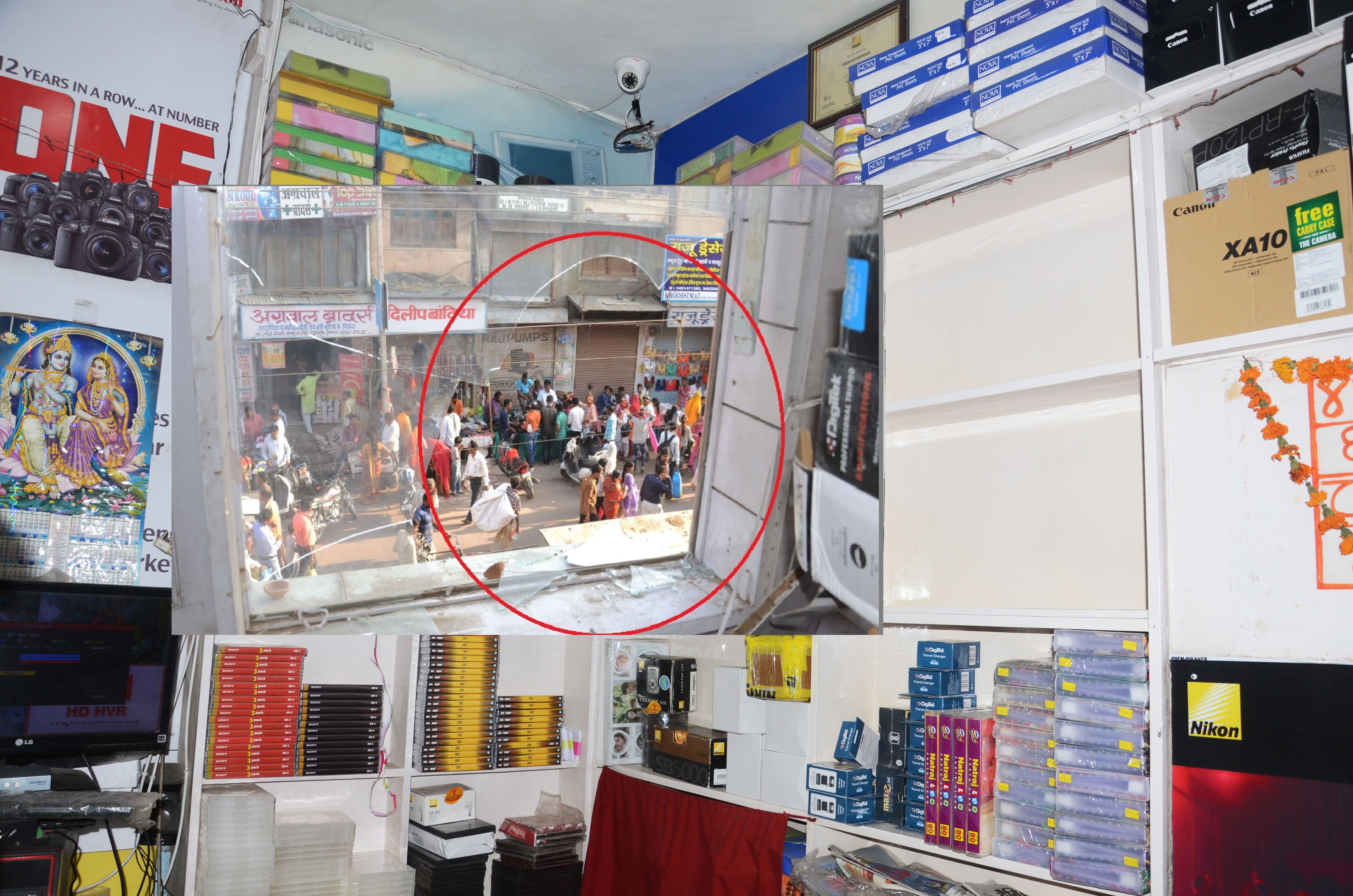 जानकारी अनुसार चोरों ने मोहन प्लाजा के फस्र्ट फ्लोर पर प्रेम एंटरप्राइजेज की दुकान में धावा बोला। चोर केईएम रोड की तरफ वाली खिड़की का शीशा तोड़कर दुकान में घुसे थे। झंवरो का चौक निवासी दुकान संचालक प्रेमसुख ओझा ने बताया कि शनिवार रात लगभग नौ बजे वे दुकान बंद करके घर गए थे। रविवार सुबह दुकान के शीशे टूटे होने की सूचना मिली। इसके बाद वे दुकान पहुंचे। चोर दुकान से अच्छी क्वालिटी ११ फोटोशूट कैमरे चुरा लग गए। इनकी कीमत लाखों रुपए बताई गई है।