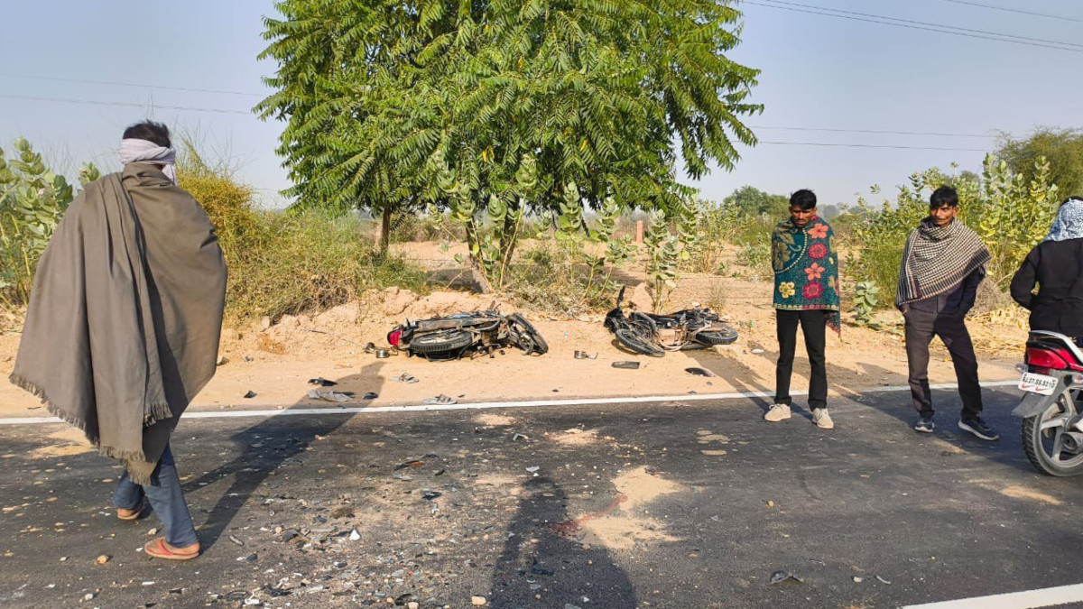 बीकानेर। पांचू थाना इलाके में दो बाइक आमने-सामने टकरा गईं, जिससे तीन जनों की मौत हो गई। मृतकों में दो सगे भाई हैं। एसएचओ रामकेश मीणा ने बताया कि कक्कू निवासी प्रमोद व राकेश पुत्र भंवरलाल मेघवाल रविवार रात को बाइक पर नोखा से कक्कू आ रहे थे। वहीं भादला निवासी मेघाराम (30) पुत्र देवाराम कुम्हार बाइक पर भादला से नोखा आ रहा था। कक्कू पेट्रोल पंप के पास दोनों बाइक की आमने-सामने भिड़ंत हो गई, जिससे प्रमोद व मेघाराम की मौत पर मौत हो गई, जबकि राकेश ने अस्पताल में दम तोड़ दिया। प्रमोद व राकेश दोनों सगे भाई हैं।