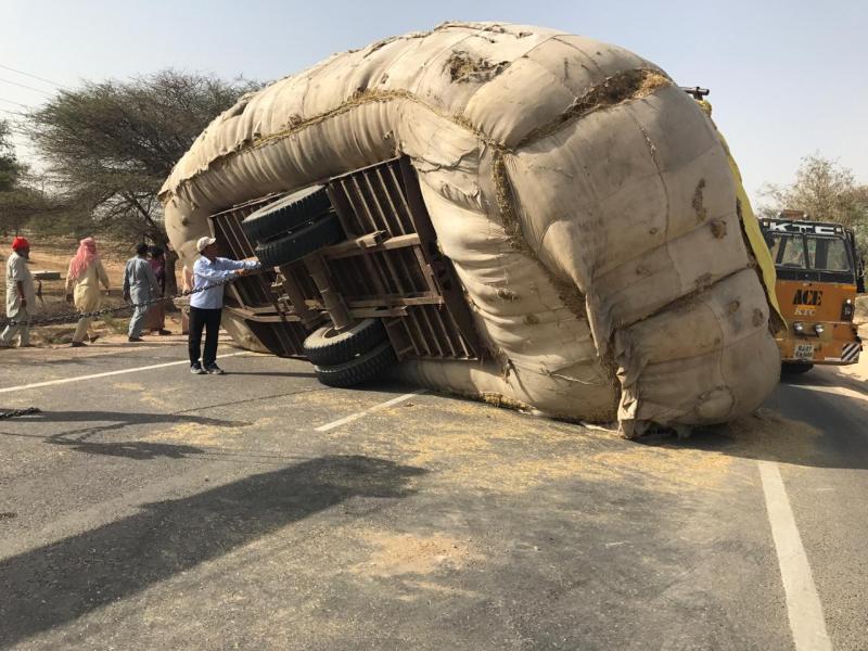 बीकानेर. महाजन. यहां से करीब 8 किमी दूर राजमार्ग संख्या 15 पर मोखमपुरा की तरफ रविवार सुबह तूड़ी से भरा एक ट्रैक्टर ट्रोला सड़क के बीच पलट जाने से आवागमन बाधित हो गया। हालांकि हादसे में कोई जनहानि नहीं हुई पर तीन घण्टे तक राजमार्ग जाम रहने से वाहन चालकों व यात्रियों को भारी परेशानी का सामना करना पड़ा। जानकारी के अनुसार सूरतगढ़ की तरफ से तूड़ी भरकर लूणकरणसर की तरफ जा रहा ट्रेक्टर ट्रोला मोखमपुरा के पास अनियंत्रित होकर पलट गया। इससे राजमार्ग बन्द हो गया।