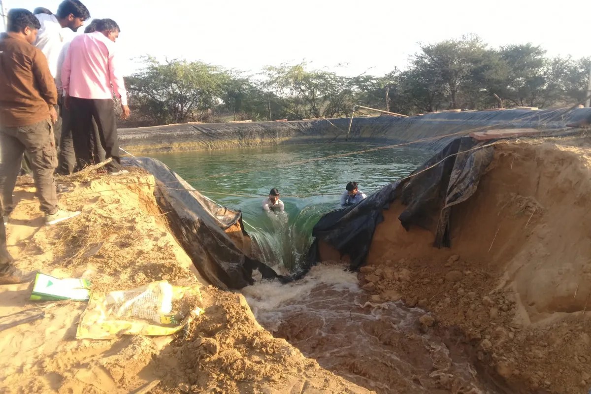 डिग्गी को तोड़कर पानी निकालते हुए। फोटो- पत्रिका