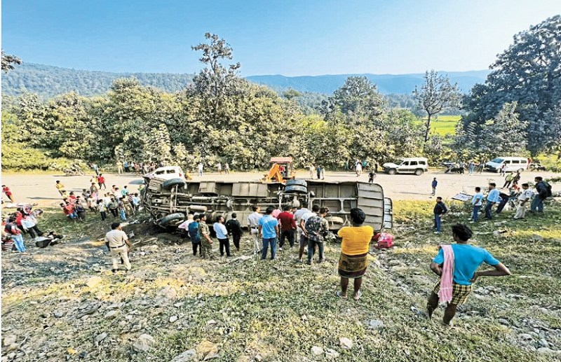 प्रयागराज से लौट रही बस केंदा घाटी के पास अनियंत्रित होकर पलटी