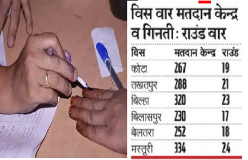 प्रत्येक टेबल में एक मतदान केन्द्र के मतो की गिनती होगी। बिलासपुर विधानसभा क्षेत्र में सबसे कम मतदान केन्द्र 230 हैं। यहां 17 राउंड में मतों की गिनती पूरी होगी। इसके बाद बेलतरा विधानसभा क्षेत्र में कुल 252 मतदान केन्द्र है और यहां 18 राउंड में मतों की गिनती पूरी होगी। इसी प्रकार कोटा विधानसभा में कुल 267 मतदान केन्द्र है और 19 राउंड में मतों की गिनती पूरी होगी। तखतपुर विधानसभा में 288 केन्द्र होने के कारण यहां 21 राउंड , बिल्हा विधानसभा में 320 मतदान केन्द्र होने के कारण 21 राउंड और मस्तूरी विधानसभा क्षेत्र में 334 मतदान केन्द्र होने के कारण 24 राउंड में मतों की गिनती पूरी होगी।