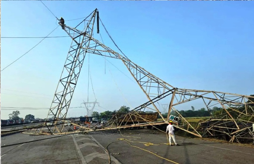 दो ट्रकों के भिड़ंत से सड़क पर गिरा बिजली टावर